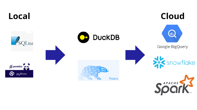 Longtemps, la data a oscillé entre deux modèles : le traitement local sur un laptop, tant que la donnée tient entièrement en RAM (sinon pandas.read_csv échoue), et le cloud, qui traite les données par morceaux entre plusieurs serveurs.