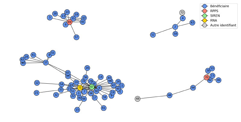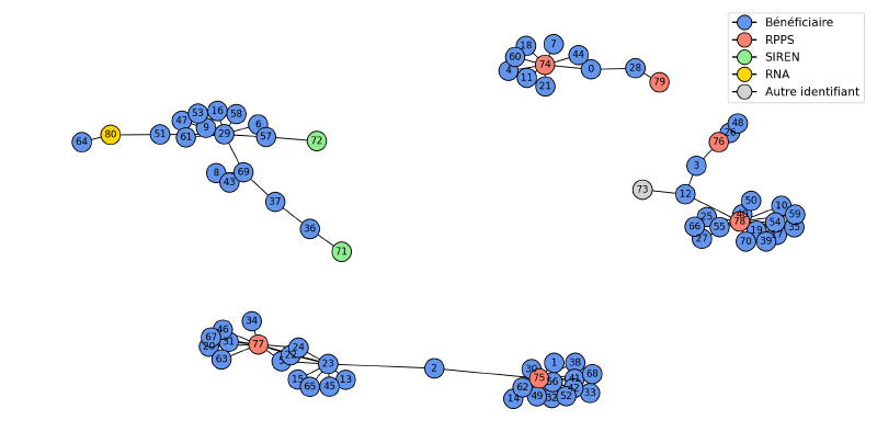 Les étapes précédentes produisent un réseau de liens entre identifiants : liens entre identifiants internes et RPPS, SIREN, RNA, ou liens directs entre comptes internes. On peut représenter tout cela sous forme de graphe (chaque nœud = un identifiant interne, RPPS, SIREN, etc. ; les arêtes = les règles métier qui les relient). On voit ainsi des blocs de comptes liés entre eux de façon plus ou moins directe, séparés du reste. Chaque bloc correspond alors à une entité réelle ; les comptes qu’il contient sont les doublons ou variantes de cette entité dans les déclarations. Certains nœuds n’avaient au départ ni RNA ni SIREN mais ont été rattachés à un bloc grâce à la similarité des noms ou au matching exact. On applique un algorithme de composantes connectées pour regrouper tous les nœuds d’un même bloc, puis on fusionne les informations pour construire une méta-entité avec les données les plus propres issues de tous ces comptes.