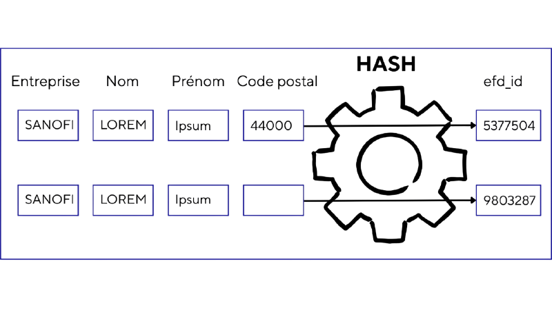 Techniquement, nous utilisons une fonction de hachage qui prend en entrée une chaîne formée de ces champs et renvoie un entier en apparence aléatoire. Une même combinaison, reprise dans plusieurs déclarations, produit toujours le même entier. Une chaîne légèrement différente produit un entier différent, sans lien apparent avec les autres. Le risque est la collision : deux chaînes distinctes (par exemple à cause de coquilles) qui produiraient le même hash. En choisissant un espace de hachage bien plus grand que le nombre de combinaisons attendu, on peut considérer la probabilité de collision comme négligeable.