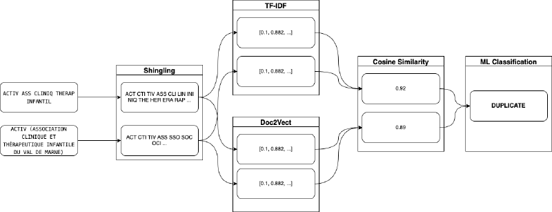 Nous avons mis en place une approche par machine learning. On découpe d’abord chaque nom d’association en trigrammes (ex. « ACTIV » → ACT, CTI, TIV) pour obtenir une liste de tokens. Cela permet d’appliquer ensuite des techniques classiques du NLP pour représenter chaque association par un vecteur. On peut alors obtenir une notion de similarité entre deux associations en comparant leurs vecteurs. On peut alors utiliser plusieurs notions de similarité pour entrainer un modèle de machine learning qui apprendra à différencier les variantes d’une même entité avec de noms d’entités différentes.
