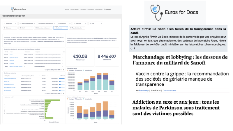 Euros for Docs a été créée pour pallier ces deux limites et rendre la transparence sanitaire réellement exploitable. L’association poursuit deux objectifs : améliorer la qualité des données en fusionnant les variantes d’un même professionnel, et proposer sur son site un tableau de bord donnant un accès direct aux principaux indicateurs de conflits d’intérêts. Aujourd’hui, les journalistes citent en priorité Euros for Docs plutôt que Transparence Santé comme source pour ces données.