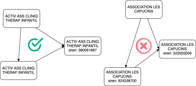 Il s’agit ici non pas d’attribuer un RPPS ou un SIREN à un compte, mais de repérer des comptes que nous avons créés séparément alors qu’ils désignent probablement la même entité (par exemple parce que déclarés par des entreprises différentes). Premier cas : trois comptes bénéficiaires portent le même nom d’association, un seul a un numéro SIREN, les deux autres non. Comme il n’y a aucune incohérence, on considère que ces comptes sont liés ; le SIREN pourra ensuite se propager aux deux comptes qui n’en avaient pas. Deuxième cas : même nom d’association, mais deux comptes ont un SIREN et le troisième n’en a pas ; les deux SIREN sont différents. On ne peut pas savoir lequel attribuer au troisième compte. Comme pour l’ambiguïté sur les RPPS, on ne crée pas de lien entre ces comptes : ils restent distincts pour éviter les faux positifs.