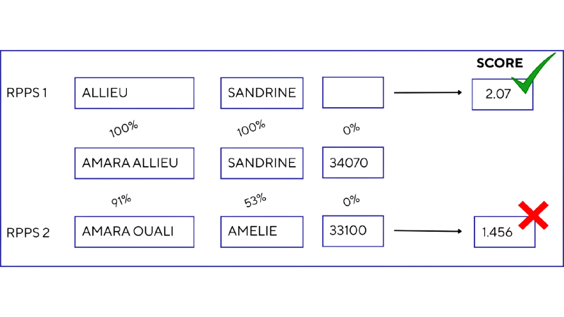 Concrètement, nous comparons d’un côté les informations déclarées par l’entreprise{nom, prénom, code postal, profession) et de l’autre les informations officielles du répertoire des professionnels de santé. L’étape suivante consiste à calculer un score de similarité et à conserver le RPPS qui obtient le meilleur score. Le score combine plusieurs éléments : similarité des chaînes nom/prénom (distance de Jaro-Winkler), prise en compte des noms composés (une seule partie du nom peut être déclarée ici ou là), et des correctifs liés à la profession et au code postal. Dans l’exemple présenté, une déclaration concerne « Sandrine Amara-Allieu » mais deux RPPS sont candidats (Sandrine Allieu et Amélie Amara-Ouali) ; la seule similarité Jaro-Winkler sur le nom favoriserait le mauvais RPPS, un correctif sur les noms composés permet de retenir le bon.