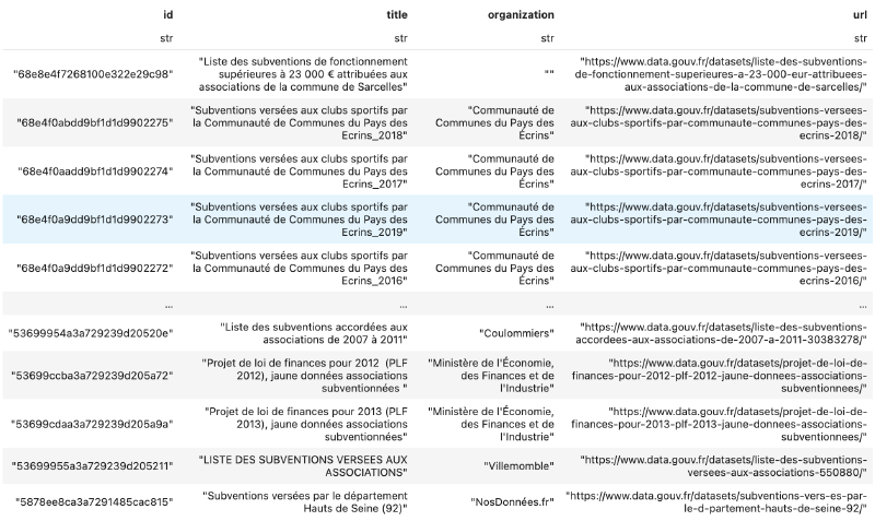 Notre première étape de la pipeline consiste donc à identifier sur data.gouv les jeux de données qui semblent concerner des subventions publiques. data.gouv possède justement un catalogue qui recense l’ensemble de fichiers présents sur la plateforme. Pour chaque fichier, un ensemble de metadonnées sont disponibles telles que le titre, la description ou l’url de téléchargement.