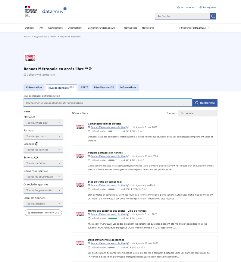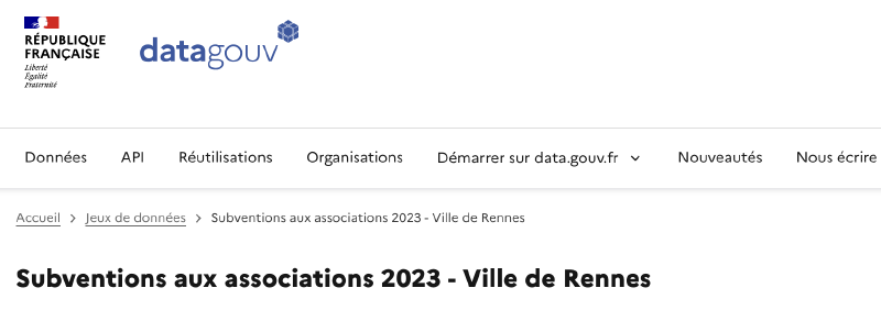 Le deuxième challenge est alors d’identifier les datasets qui correspondent à des subventions aux associations parmi l’énorme diversité que propose data.gouv. Par exemple, pour rester sur l’exemple de Rennes, le fichier de subvention est déposé aux cotés d’un fichier sur les vergers partagés ou les menus des cantines de la métropole.