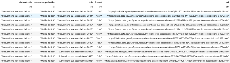 Les collectivités proposent régulièrement le même fichier de subvention en plusieurs formats, généralement CSV et JSON. Notre première recherche par mots-clés dans le catalogue data.gouv sélectionne donc toutes les versions présentes d’un même jeu de données. Nous sommes donc à risque d’intégrer plusieurs fois les mêmes données et surestimer les montants versés par les collectivités. En comparant les titres et descriptions des fichiers nous sommes capables d’identifier des doublons dans des formats différents.