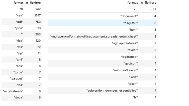 Mais tous les formats de fichiers ne se valent pas en termes de facilité de lecture, en particulier lorsqu’il faut les lire en grand nombre de manière automatique. Comme nous le verrons plus loin, la lecture de fichiers CSV nécessite de connaître plusieurs paramètres que l’on devra deviner. A l’inverse, un fichier de type parquet se lit très facilement. Lorsque nous avons accès à plusieurs format d’un même jeu de données, nous pouvons sélectionner le format le plus pratique pour la lecture.