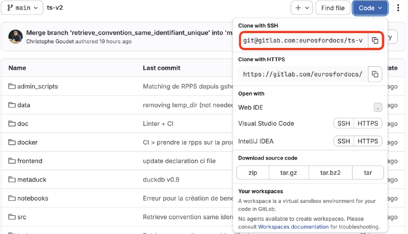 git clone git@gitlab.com:eurosfordocs/ts-v2.gitCelle-ci va télécharger l’intégralité du projet sur votre machine. À partir de maintenant, vous pouvez modifier à volonté le code sur la machine sans que cela n’impacte le projet pour les autres contributeurs. Les prochaines étapes expliqueront comment partager vos modifications.