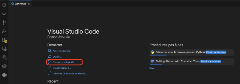 Une manière alternative de télécharger le projet est d’ouvrir directement votre éditeur de code. Tous les éditeurs modernes ont une interface pour ouvrir un projet à partir d’une URL. Par exemple, la page d’accueil de VSCode propose justement l’option de cloner un dépôt Git.
